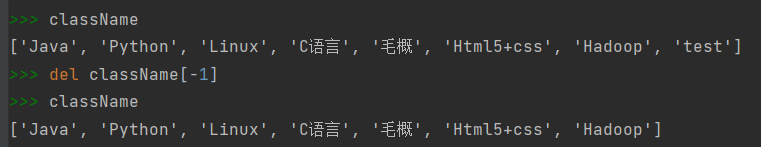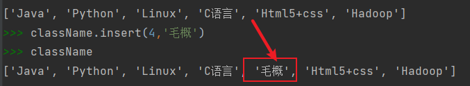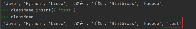 - insert(索引位置,要添加的元素):在指定的索引的前面,添加元素;索引超出范围,则默认添加到列表的最后。