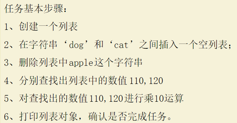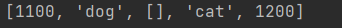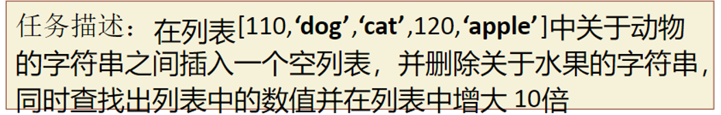 1 # -*- coding:utf-8 -*- 2 task_list = [110, 'dog', 'cat', 120, 'apple'] 3 task_list.insert(2, []) 4 # task_list.pop() 5 task_list.remove('apple') 6 num_index1 = task_list.index(110) # 查询元素位置 7 num_index2 = task_list.index(120) 8 # print(task_list[num_index1]) #110 9 # print(task_list[num_index2]) #120 10 task_list[num_index1] *= 10 # 将查询出来的元素进行自乘运算并赋值修改 11 task_list[num_index2] *= 10 12 print(task_list)
