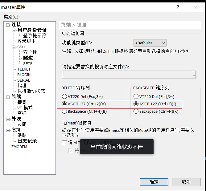 文件→属性→终端→键盘,把 delete和 backspace序列改为ASCIl 127即可。