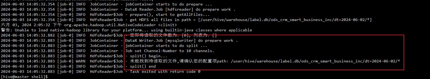 com.alibaba.datax.common.exception.DataXException: Code:[HdfsReader-08], Description:[您尝试读取的文件目录为空.]. - 未能找到待读取的文件,请确认您的配置项path: /user/hive/warehouse/dws.db/dws_index_business_xzkh/dt_date=2024-01-02