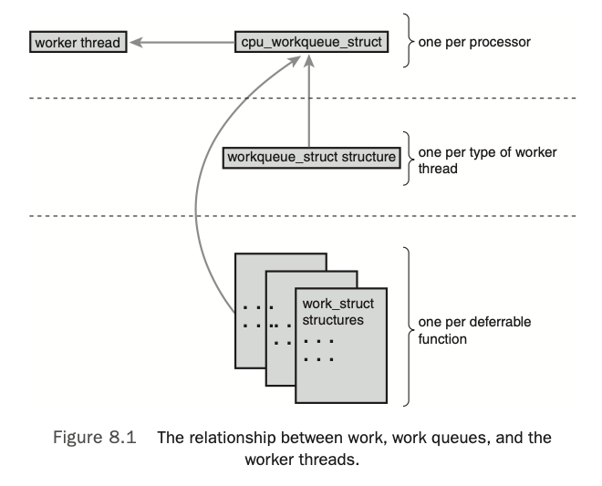 上面这个图是书中的,kernel 4.15中的work queue 实现和书中的描述有些变化,这里也讲一下kernel 4.15目前的实现。首先,基本流程和大部分数据结构是类似的,只是略有变化。