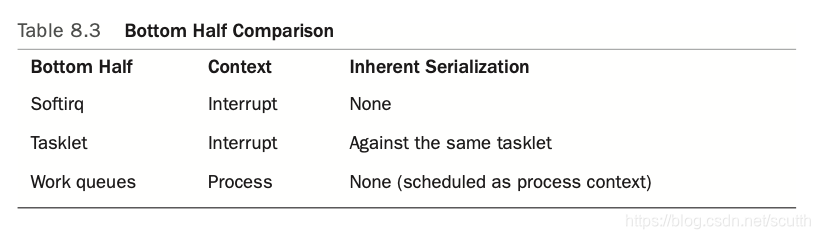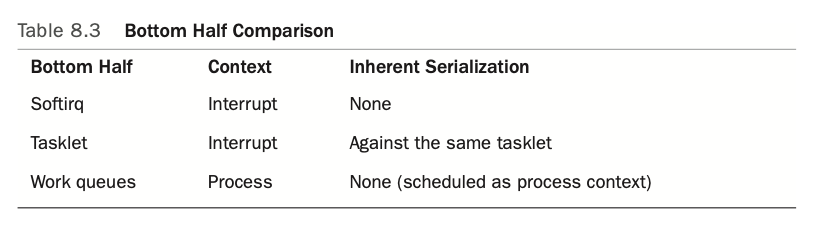 因为上面的这些限制,interrupt handler是经过特殊设计的,只有那些对时间比较敏感的操作(比如hardware产生了数据,需要尽快的copy到memory),会放在interrupt handler中处理,其他对时间不敏感的操作适当延后执行。因此整个对interrupt的处理,其实就分成了两个部分:上半部和下半部。