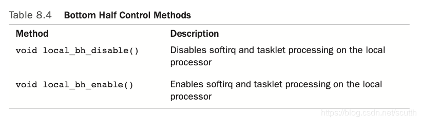 通常情况下,只关闭下半部是不够的,还要加锁。如果你是在kernel core code中,一般只要关闭下半部就够了。调用local_bh_disable可以关闭所有的中断下半部,包括softirq和tasklet,然后使用local_bh_enable来打开中断下半部。