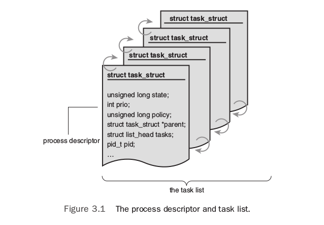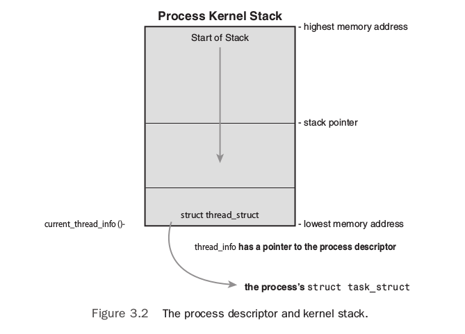 kernel使用struct task_struct来管理进程,而process descriptor实际上就是task_struct类型的指针而已,这个struct里包含了一个进程的所有信息,比如打开的文件,虚拟地址空间,pending signals,进程的状态以及其他的很多信息,因此结构体本身非常大,至少有1.7KB。