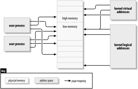 如果你有一个逻辑地址,可以通过__pa()获取到它对应的物理地址;物理地址也可以通过__va()获取它的逻辑地址,但只限于low memory page,不能用于high-memory page。