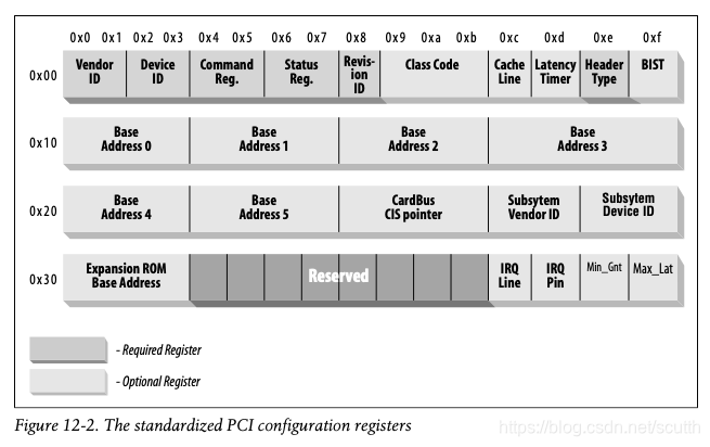 PCI spec规定每个config space至少有256 byte那么大,PCIE有4K。256byte的话,结构如下: