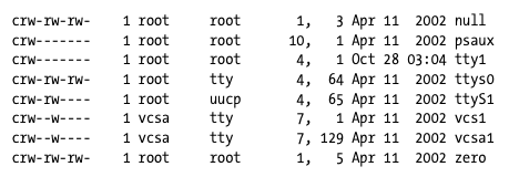 在/dev目录下,通过ls -l可以看到这些device有char device和block device,每个device有major/minor number。