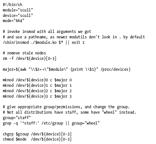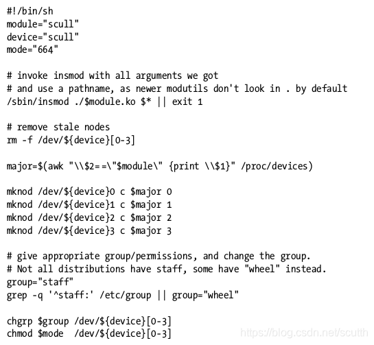 上面的例子,就是insmod成功以后,通过读取/proc/devices找到自己的device,并获取major number,再根据major number创建/dev/scull设备节点。