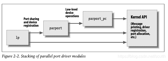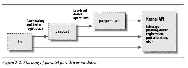 之前提高的modprobe命令,就适用于这样的module stack场景,它可以通过查找帮助module driver把stack上的所有的module都load进来。自己在开发device driver的时候,也可以通过这种方式,把driver分成几个独立的module,然后通过相互的依赖关系组成一个driver stack,每一个module都可以做的尽量简单,这样可以方便开发,提高效率。而每一个module都可以export自己的symbol供其他的module使用,类似用户态程序的interface,每一个module做到高内聚低耦合。