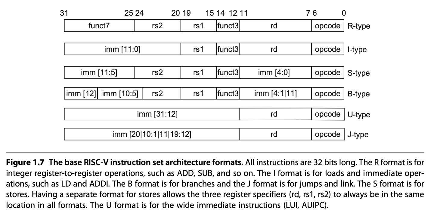 R格式用于整数寄存器到寄存器的操作,比如ADD,SUB等;I格式的用于load操作以及立即数操作,如LD,ADDI等;B格式用于分支;J格式用于跳转和link?;S格式用于store。