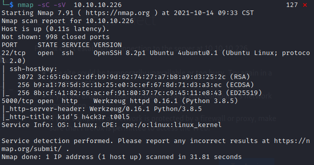 对端口信息进行扫描,开放端口有22,5000;