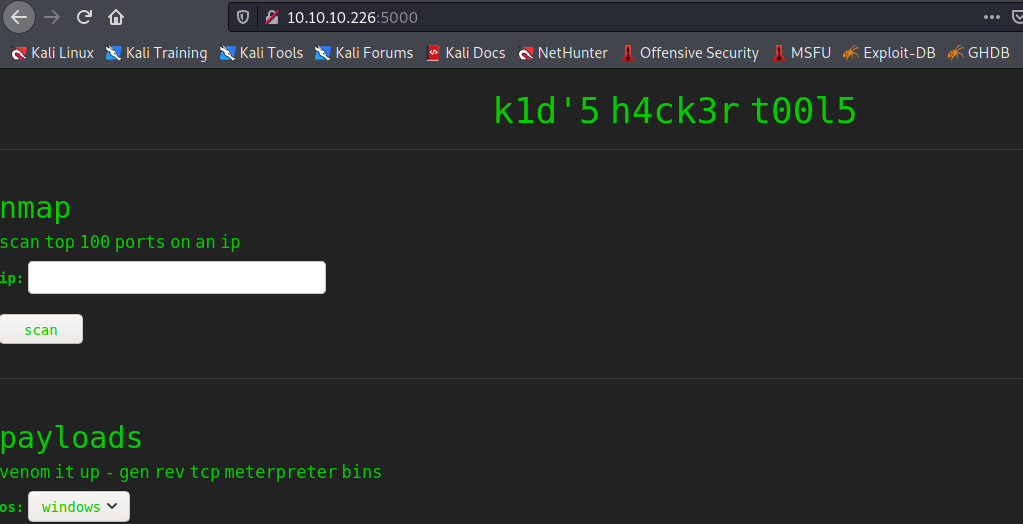 访问5000端口,发现是一个集成工具的页面,分别有nmap、msfvenom、searchsploit;