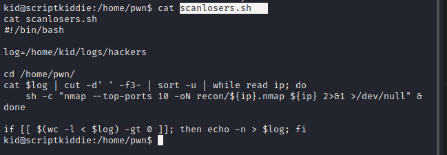 pwn用户目录下还存在一个scanlosers.sh文件,查看此文件;