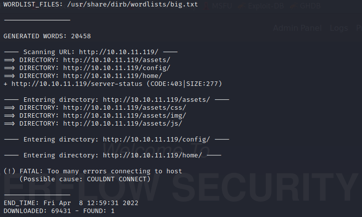 2)使用dirb进行目录扫描,扫描到的目录有/assets、/config、/home。
