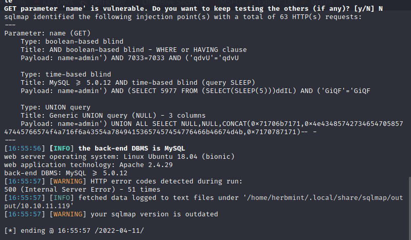 9)尝试构造单引号报错,页面不显示任何信息,抓包传输显示服务器错误,判断此处可能存在注入漏洞,使用sqlmap进行判断发现确实存在注入漏洞。