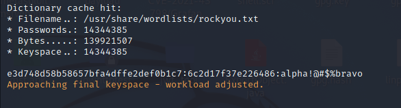 5)获取到sitemark的值之后,继续使用hashcat来解密hash的值。这里我们只解密出了editor账户的密码alpha!@$%bravo。