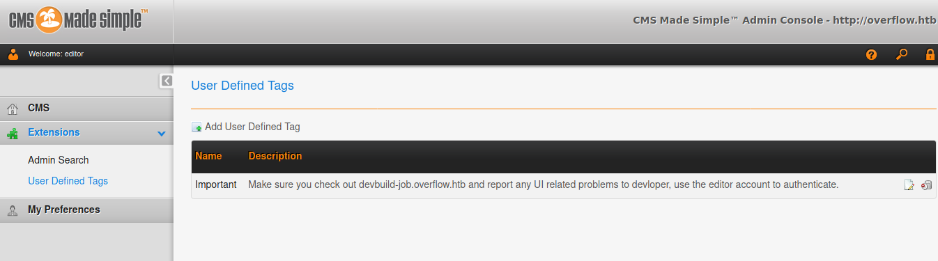 6)登录此cms系统之后,对此系统的模块进行查看,在Extensions模块下的User Defined Tags有提及到另一台主机,并且提及到此台主机可以使用editor账户进行登录。
