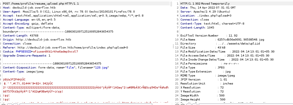 发现提交完毕请求之后进行了一个302跳转,此页面信息显示使用了exiftool工具。