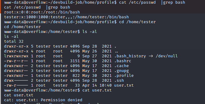1)查看具有bash权限的用户,发现有root和tester两个用户,并且在tester的用户目录下发现存在user.txt文件,但是我们无权访问。