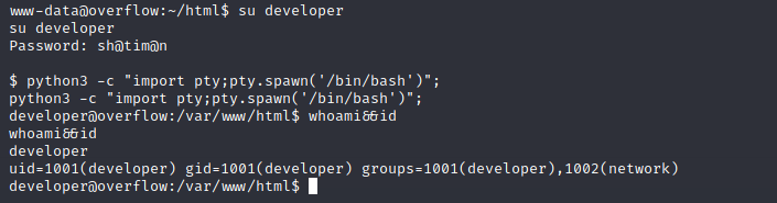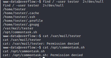tester@overflow:/tmp$ echo "tester ALL=(ALL) NOPASSWD:ALL" > /tmp/sudoers