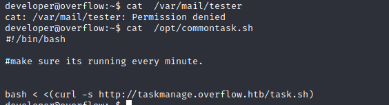 5)邮箱信息依旧无权读取,但是那个脚本文件可以被查看,这个脚本文件的大致内容是每分钟执行一次从http://taskmanage.overflow.htb主机下载task.sh脚本文件。