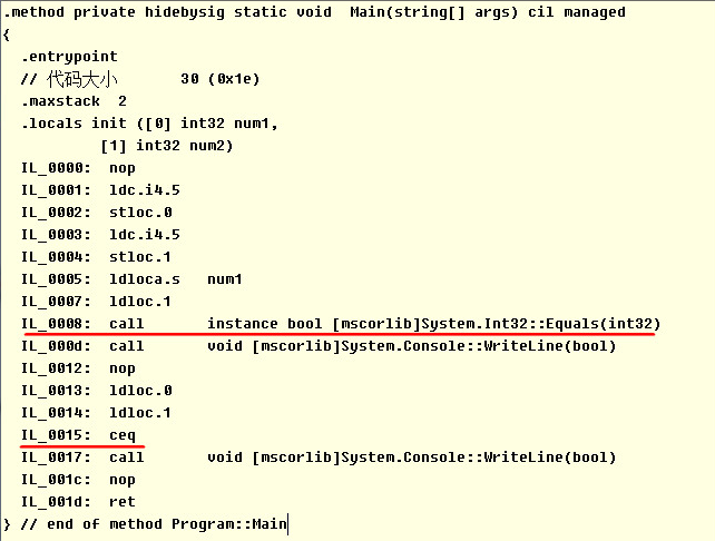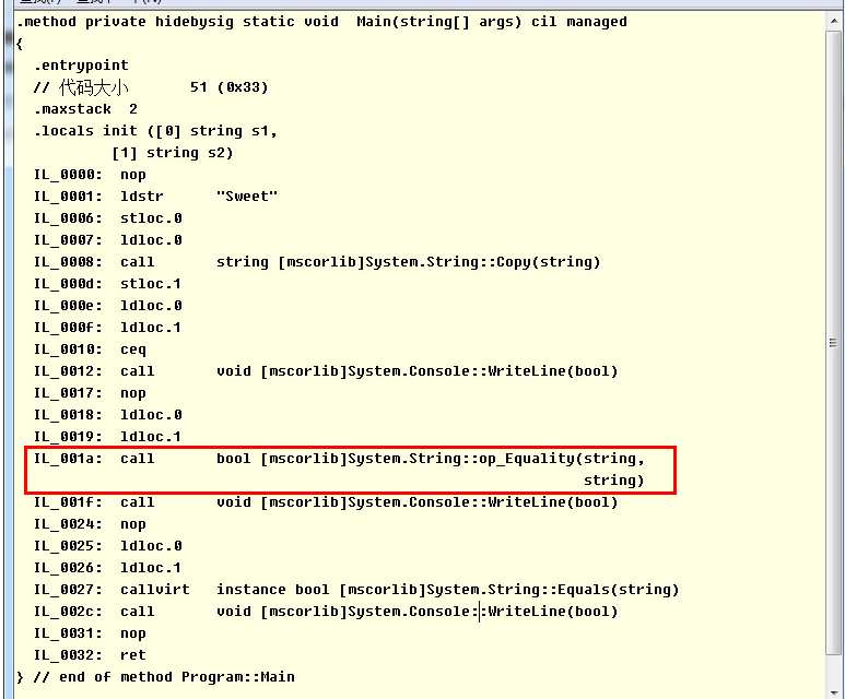 如果您以前从来没有接触过IL指令,不过没关系,在这里您不需要理解所有的指令,我们只是想了解这两个比较方式的差异。