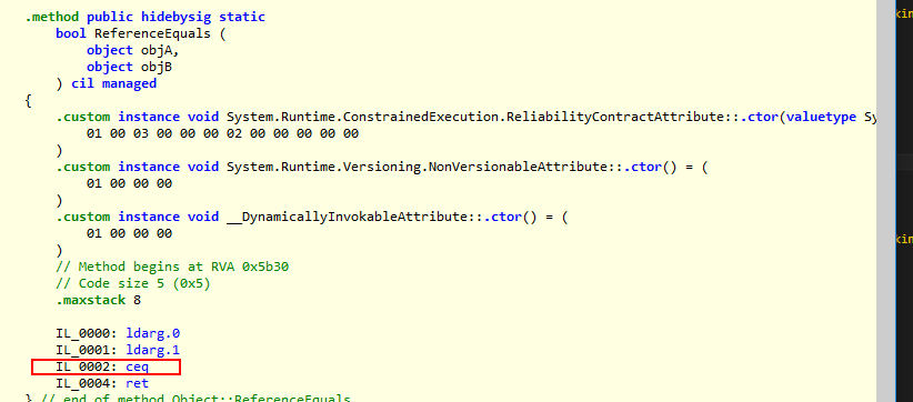 您可以看到,==运行符使用的是ceq指令,它是使用CPU寄存器来比较两个值。C#==运算符底层机制是使用ceq指令对基元类型进行比较,而不是调用Equals方法。