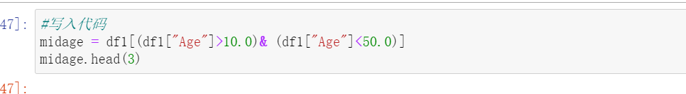 任务二: 以"Age"为条件,将年龄在10岁以上和50岁以下的乘客信息显示出来,并将这个数据命名为midage