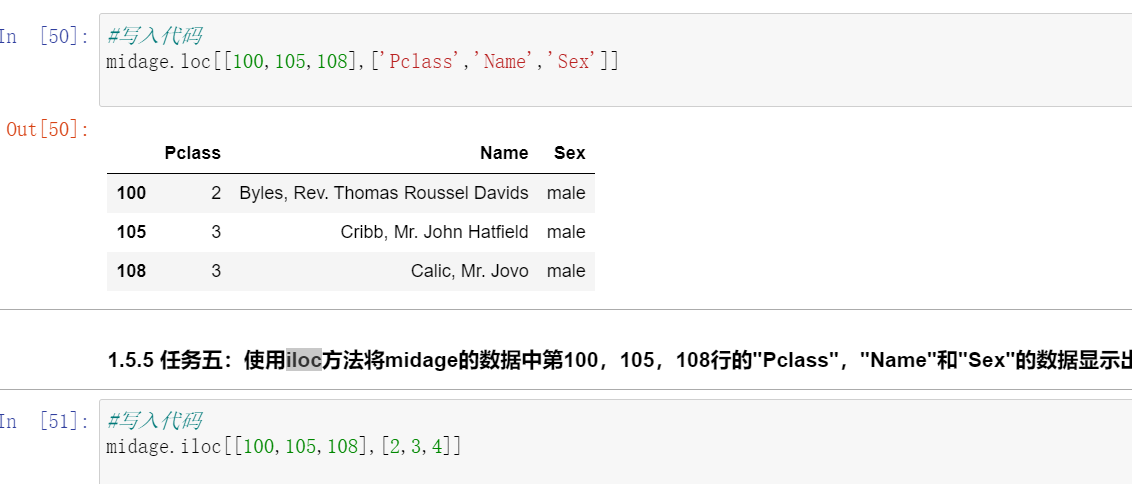 任务四:使用loc、iloc方法将midage的数据中第100,105,108行的"Pclass","Name"和"Sex"的数据显示出来