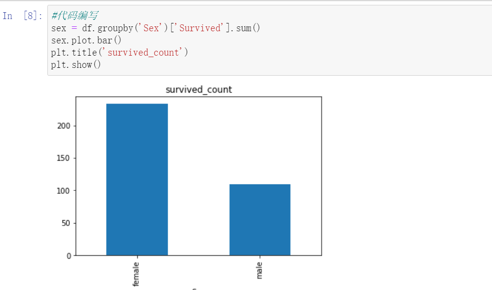 2.7.2 任务二:可视化展示泰坦尼克号数据集中男女中生存人数分布情况(用柱状图试试)。