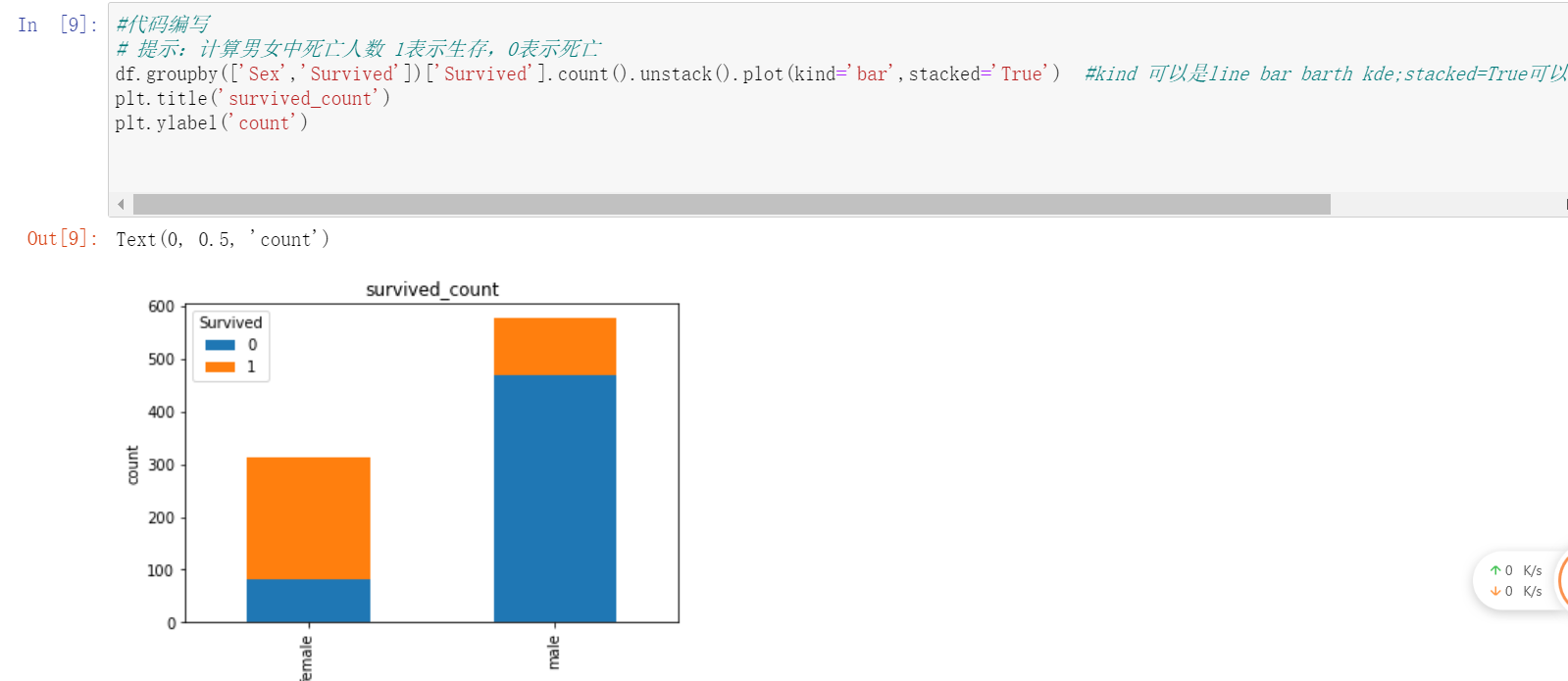 2.7.3 任务三:可视化展示泰坦尼克号数据集中男女中生存人与死亡人数的比例图(用柱状图试试)。