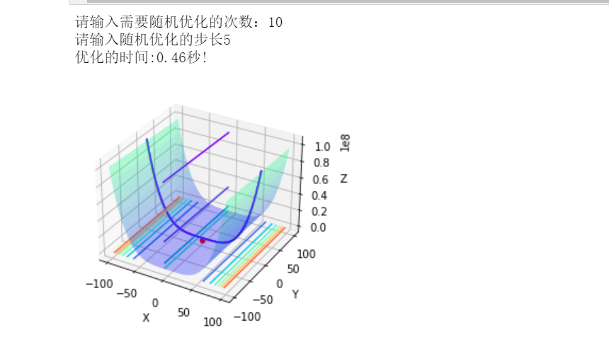 class Rosenbrock(): def __init__(self): self.x1 = np.arange(-100, 100, 0.0001) self.x2 = np.arange(-100, 100, 0.0001) #self.x1, self.x2 = np.meshgrid(self.x1, self.x2) self.a = 1 self.b = 1 self.newton_times = 1000 self.answers = [] self.min_answer_z = [] # 准备数据 def data(self): z = np.square(self.a - self.x1) + self.b * np.square(self.x2 - np.square(self.x1)) #print(z.shape) return z # 随机牛顿 def snt(self,x1,x2,z,alpha): rand_init = np.random.randint(0,z.shape[0]) x1_init,x2_init,z_init = x1[rand_init],x2[rand_init],z[rand_init] x_0 =np.array([x1_init,x2_init]).reshape((-1,1)) #print(x_0) for i in range(self.newton_times): x_i = x_0 - np.matmul(np.linalg.inv(np.array([[12*x2_init**2-4*x2_init+2,-4*x1_init],[-4*x1_init,2]])),np.array([4*x1_init**3-4*x1_init*x2_init+2*x1_init-2,-2*x1_init**2+2*x2_init]).reshape((-1,1))) x_0 = x_i x1_init = x_0[0,0] x2_init = x_0[1,0] answer = x_0 return answer # 绘图 def plot_data(self,min_x1,min_x2,min_z): x1 = np.arange(-100, 100, 0.1) x2 = np.arange(-100, 100, 0.1) x1, x2 = np.meshgrid(x1, x2) a = 1 b = 1 z = np.square(a - x1) + b * np.square(x2 - np.square(x1)) fig4 = plt.figure() ax4 = plt.axes(projection='3d') ax4.plot_surface(x1, x2, z, alpha=0.3, cmap='winter') # 生成表面, alpha 用于控制透明度 ax4.contour(x1, x2, z, zdir='z', offset=-3, cmap="rainbow") # 生成z方向投影,投到x-y平面 ax4.contour(x1, x2, z, zdir='x', offset=-6, cmap="rainbow") # 生成x方向投影,投到y-z平面 ax4.contour(x1, x2, z, zdir='y', offset=6, cmap="rainbow") # 生成y方向投影,投到x-z平面 ax4.contourf(x1, x2, z, zdir='y', offset=6, cmap="rainbow") # 生成y方向投影填充,投到x-z平面,contourf()函数 ax4.scatter(min_x1,min_x2,min_z,c='r') # 设定显示范围 ax4.set_xlabel('X') ax4.set_ylabel('Y') ax4.set_zlabel('Z') plt.show() # 开始 def start(self): times = int(input("请输入需要随机优化的次数:")) alpha = float(input("请输入随机优化的步长")) z = self.data() start_time = time.time() for i in range(times): answer = self.snt(self.x1,self.x2,z,alpha) self.answers.append(answer) min_answer = np.array(self.answers) for i in range(times): self.min_answer_z.append((1-min_answer[i,0,0])**2+(min_answer[i,1,0]-min_answer[i,0,0]**2)**2) optimal_z = np.min(np.array(self.min_answer_z)) optimal_z_index = np.argmin(np.array(self.min_answer_z)) optimal_x1,optimal_x2 = min_answer[optimal_z_index,0,0],min_answer[optimal_z_index,1,0] end_time = time.time() running_time = end_time-start_time print("优化的时间:%.2f秒!" % running_time) self.plot_data(optimal_x1,optimal_x2,optimal_z) if __name__ == '__main__': snt = Rosenbrock() snt.start()