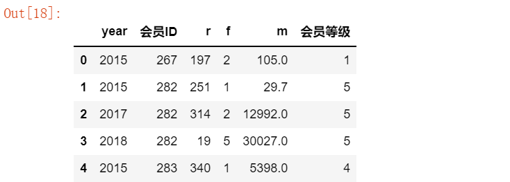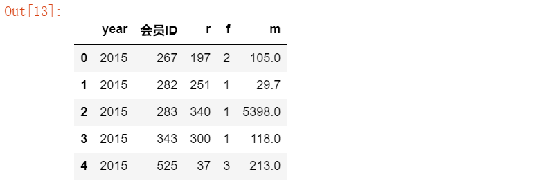 #重命名列名 rfm_gb.columns = ['year','会员ID','r','f','m'] rfm_gb.head()#预览并打印