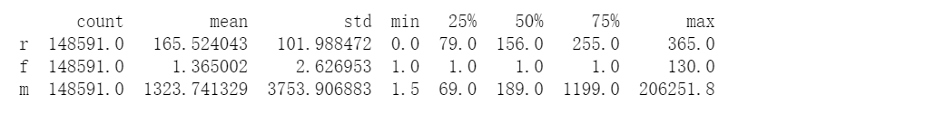 #查看数据分布 desc_pd = rfm_gb.iloc[:,2:].describe().T#由于只针对rfm三列,因此使用iloc方法,选择从第3列(索引值为2)开始的字段,调用describe方法 print(desc_pd)
