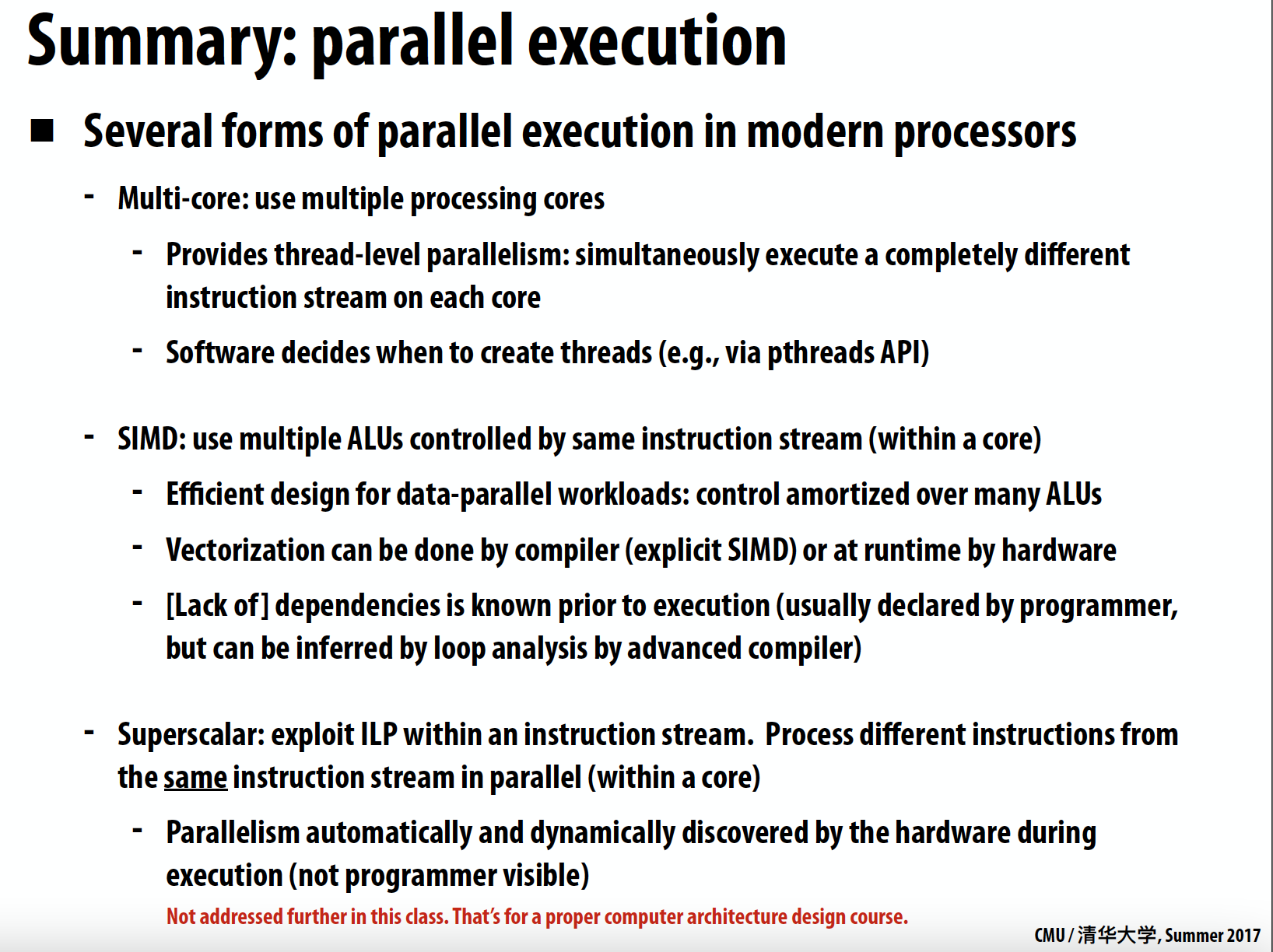 - SIMD指令(Add more ALUs):对单个指令流中的一条指令广播到多个ALU上,在单个核上并行地执行计算(vector program),例如SSE,AVX,AVX512指令集