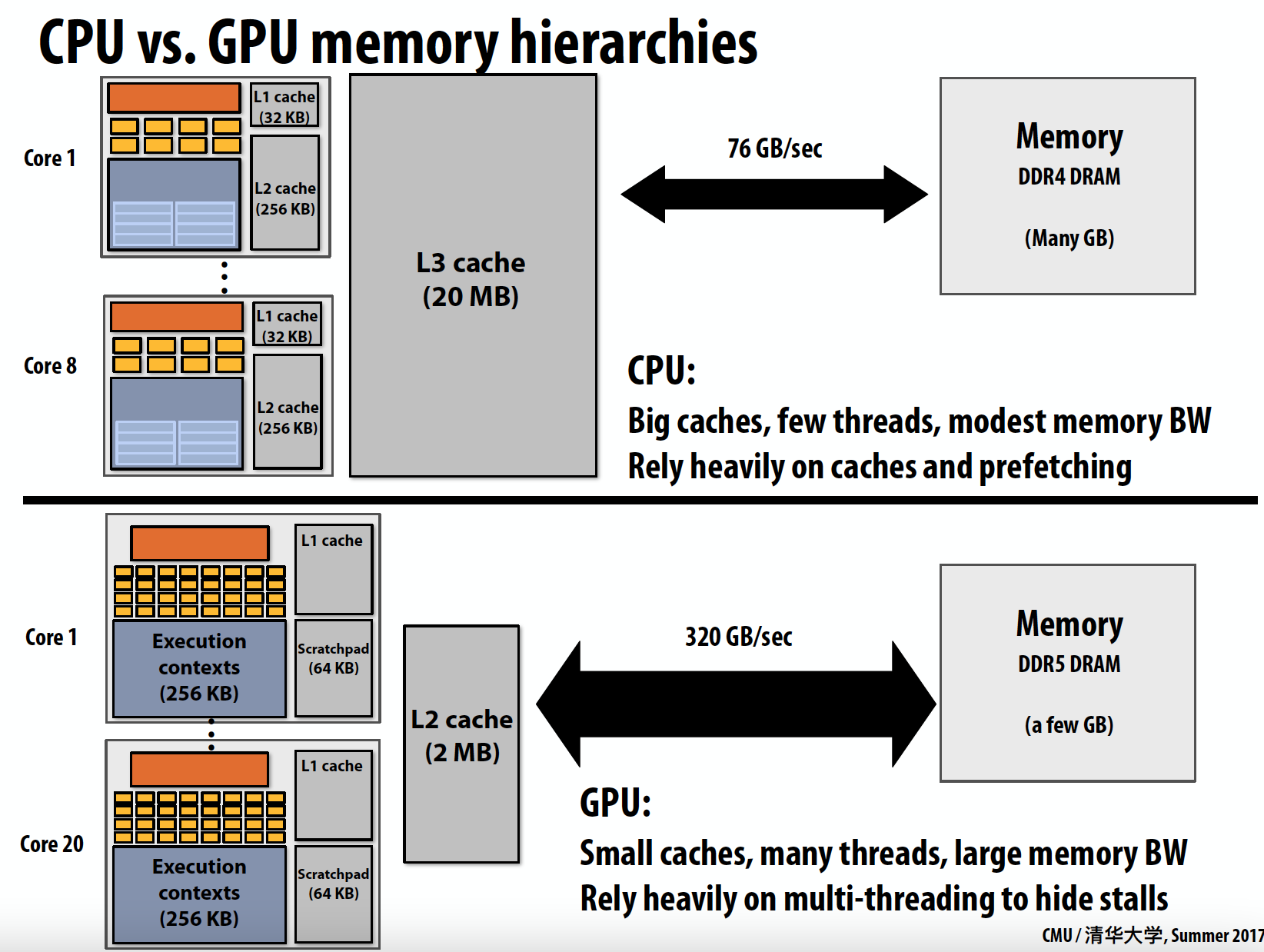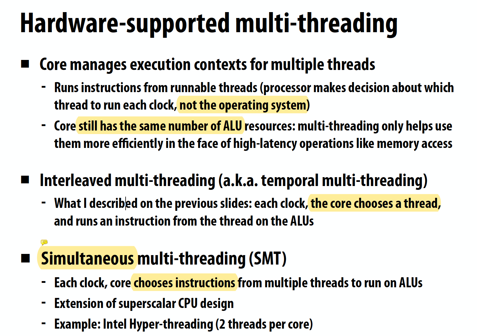- multi-threading多线程:减少stall来掩盖latency,因为多个HW thread工作,如果一个线程在等待读取,可以切到另一个线程,不会让ALU等待,因此提高了吞吐量(throughput-oriented)
