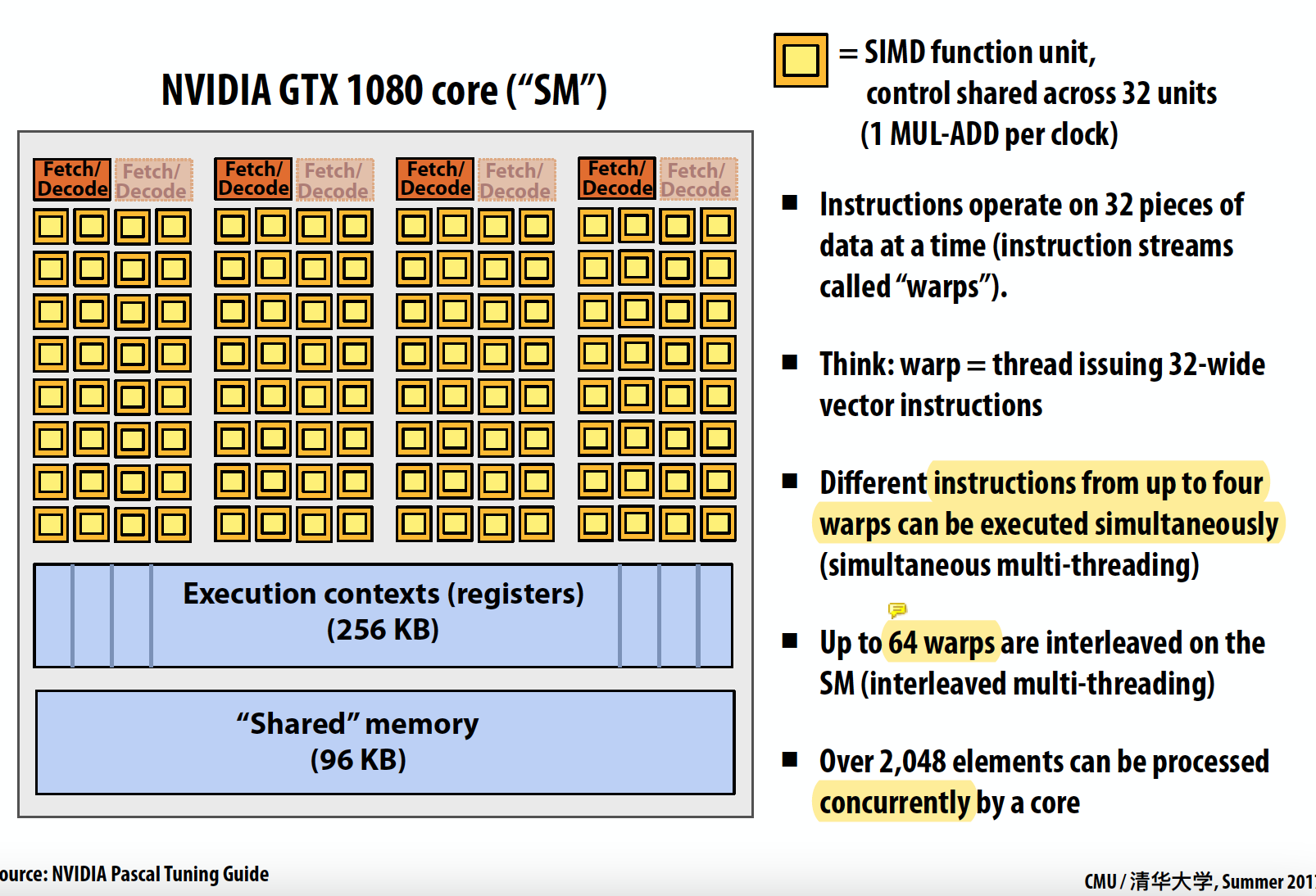 Nvidia的GPU上的一个SM里面实现了64个硬件级线程(warp),每个warp可以实现32维SIMD指令。因此每个SM上有32*64=2048个并发数据。