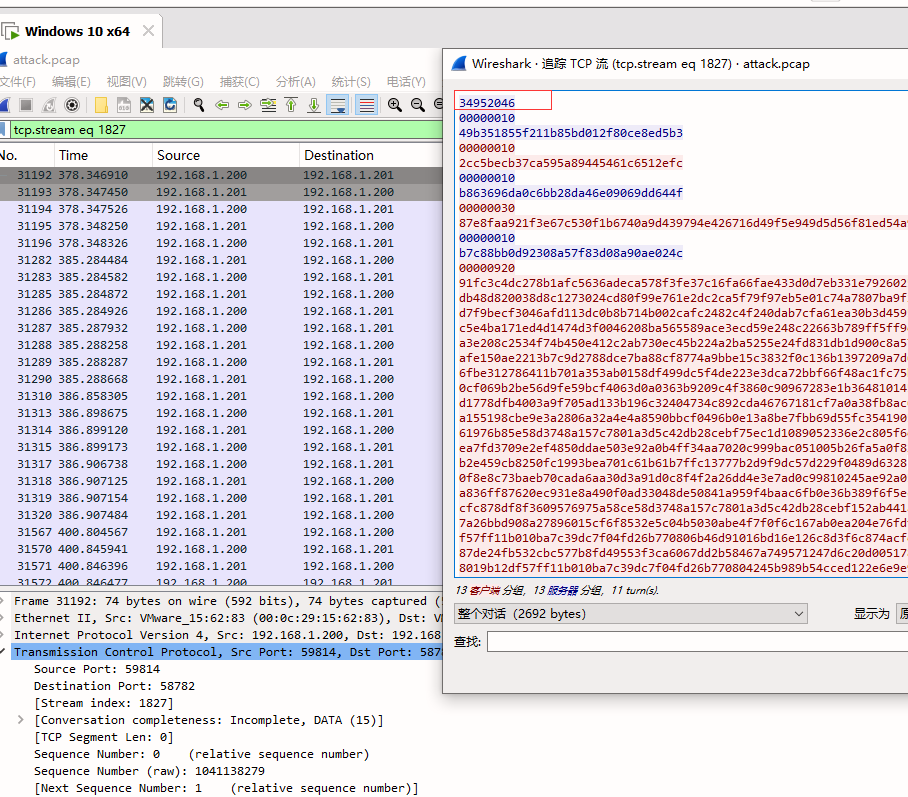 这些密文数据来自流量包中的实际通信记录,通过 Wireshark 追踪流 1827,可以获取完整的密文长度和密文序列,也就是上一题追踪到的那些,这些数据被组织成一个 DATA 数组,每两个元素为一组:第一个是密文长度的十六进制表示,第二个是对应的密文