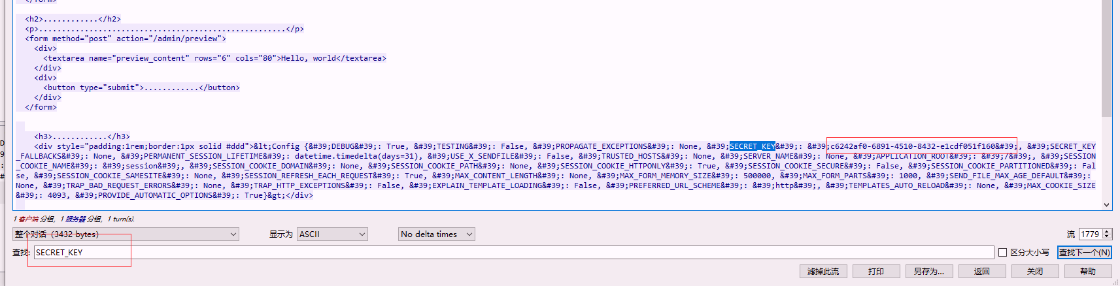这段流量是 Flask 框架应用配置对象 的完整序列化输出,攻击者通过 SSTI(服务端模板注入) 漏洞成功读取了内存中的敏感变量