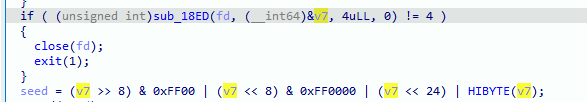 具体来说,程序首先从 C2 服务器接收一个 4 字节的种子值,然后用这个种子初始化 srand(),接着连续调用 4 次 rand() 生成 4 个 32 位整数,这 16 字节的数据就是加密密钥,也就是上一题得到的flagac46fb610b313b4f32fc642d8834b456,我们的目标是让程序在调用 rand() 时返回这个预定义密钥的各个部分