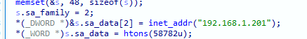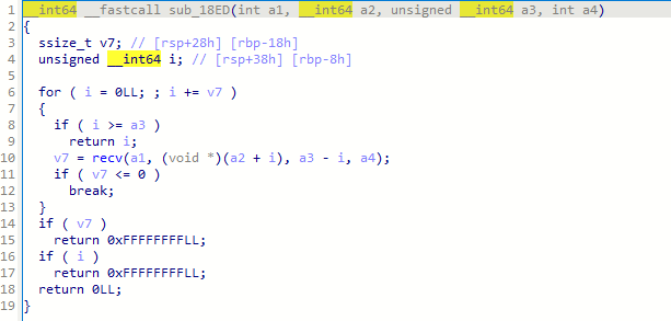然后程序通过 recv() 系统调用从 C2 服务器接收数据