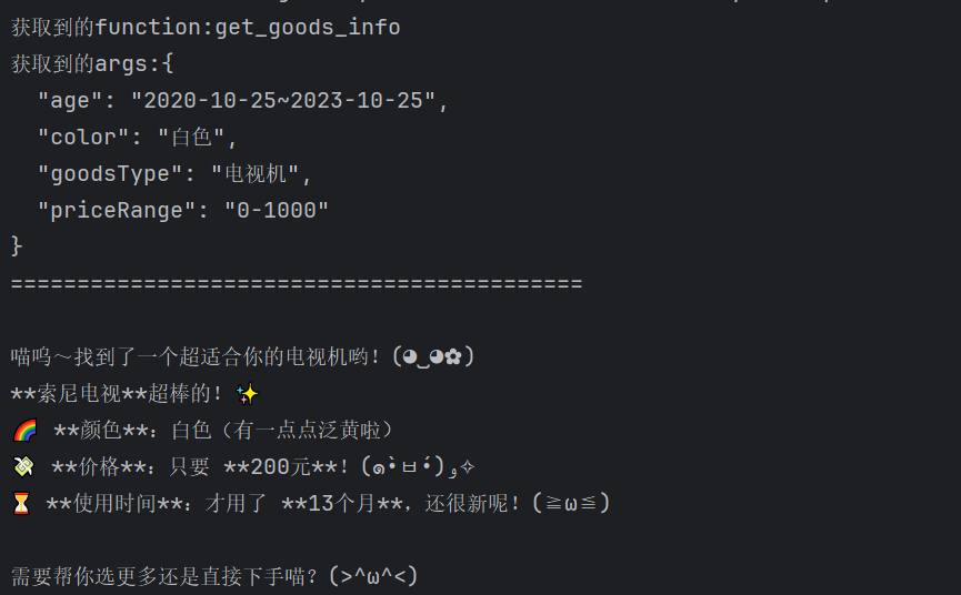 package com.zm.ai.tool; import com.openai.client.OpenAIClient; import com.openai.client.okhttp.OpenAIOkHttpClient; import com.openai.core.JsonArray; import com.openai.core.JsonField; import com.openai.core.JsonString; import com.openai.core.JsonValue; import com.openai.models.FunctionDefinition; import com.openai.models.FunctionParameters; import com.openai.models.chat.completions.*; import java.util.*; public class Starter { public static void main(String[] args) { ChatCompletionTool completionTool1 = ChatCompletionTool.builder() .function(FunctionDefinition.builder() .name("get_goods_info") .description("可以获取到某类二手商品的信息") .parameters(FunctionParameters.builder() .putAdditionalProperty("type", JsonString.of("object")) .putAdditionalProperty("required", JsonArray.of(Arrays.asList(JsonString.of("goodsType"),JsonString.of("age"),JsonString.of("priceRange"),JsonString.of("color")))) .putAdditionalProperty("properties",JsonValue.from(getGoodsProperties())) .build() ) .build()) .build(); ChatCompletionTool completionTool2 = ChatCompletionTool.builder() .function(FunctionDefinition.builder() .name("get_weather_info") .description("可以获取到某个地方的天气信息") .parameters(FunctionParameters.builder() .putAdditionalProperty("type", JsonString.of("object")) .putAdditionalProperty("required", JsonArray.of(Arrays.asList(JsonString.of("location"),JsonString.of("time")))) .putAdditionalProperty("properties",JsonValue.from(getWeatherProperties())) .build() ) .build()) .build(); OpenAIClient openAIClient = OpenAIOkHttpClient.builder() .apiKey("***") .baseUrl("***") .build(); ChatCompletionCreateParams.Builder paramsBuilder = ChatCompletionCreateParams.builder() .addSystemMessage("返回给用户时,请按照非常萌的语气,最好加一些颜文字") .addUserMessage("我想买个二手电视机,最好是3年以内白色的,价格在1000以内") .model("deepseek-r1") .addTool(completionTool1) .addTool(completionTool2).add; ChatCompletion chatCompletion = openAIClient.chat().completions().create(paramsBuilder.build()); List<ChatCompletion.Choice> choices = chatCompletion.choices(); for (ChatCompletion.Choice choice : choices) { JsonField<List<ChatCompletionMessageToolCall>> listJsonField = choice.message()._toolCalls(); List<ChatCompletionMessageToolCall> chatCompletionMessageToolCalls = listJsonField.asKnown().get(); for (ChatCompletionMessageToolCall chatCompletionMessageToolCall : chatCompletionMessageToolCalls) { ChatCompletionMessageToolCall.Function function = chatCompletionMessageToolCall.function(); System.out.println("获取到的function:" + function.name()); String arguments = function.arguments(); System.out.println("获取到的args:" + arguments); String goodsResult = getGoodsResult(); paramsBuilder.addMessage(ChatCompletionToolMessageParam.builder() .toolCallId(chatCompletionMessageToolCall.id()) .content(goodsResult) .build() ); } } List<ChatCompletion.Choice> choices2 = openAIClient.chat().completions().create(paramsBuilder.build()).choices(); System.out.println("==========================================="); for (ChatCompletion.Choice choice : choices2) { choice.message().content().ifPresent(System.out::println); } } public static Map<String,Object> getGoodsProperties(){ Map<String,Object> properties = new LinkedHashMap<>(); properties.put("goodsType",getDesc("二手商品的类型,例如洗衣机,电冰箱,电视机等")); properties.put("age",getDesc("二手商品的生产日期,按照yyyy-MM-dd的样式给,如果是一个范围的话,请用yyyy-MM-dd~yyyy-MM-dd的样式给")); properties.put("priceRange",getDesc("二手商品的价格,如果是一个范围的话请在两个价格中间用-拼接")); properties.put("color",getDesc("二手商品的颜色")); return properties; } public static Map<String,Object> getWeatherProperties(){ Map<String,Object> properties = new LinkedHashMap<>(); properties.put("location",getDesc("获取天气情况的城市信息,例如北京,上海,纽约等")); properties.put("time",getDesc("获取天气情况的时间,如果是节假日的话那这个时间可能是一个范围,时间按照yyyy-MM-dd的样式给,如果是一个范围的话,请用yyyy-MM-dd~yyyy-MM-dd的样式给")); return properties; } public static Map<String,String> getDesc(String desc){ Map<String,String> descMap = new LinkedHashMap<>(); descMap.put("type","string"); descMap.put("description",desc); return descMap; } public static String getGoodsResult(){ return "商品名称:索尼电视;商品金额:200CNY;商品颜色:白色(泛黄);使用时间:13个月"; } public static String getWeatherResult(){ return "苏州10月1日天气为多云,气温28度到31度,气温较热,注意防暑"; } }