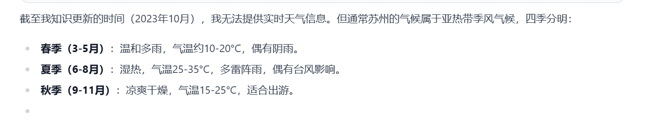 可以看到deepseek无法回答出天气,因为模型中并不提供实时天气信息查询的功能