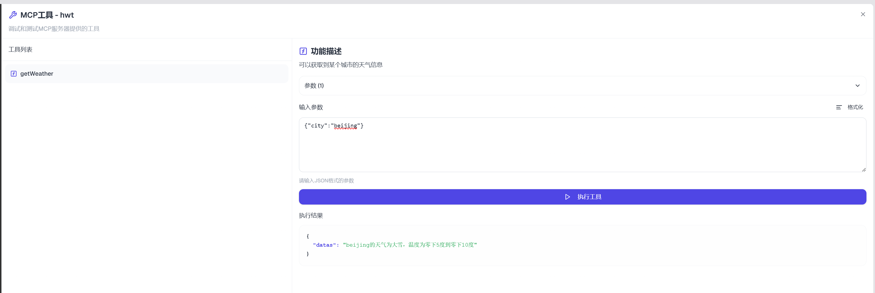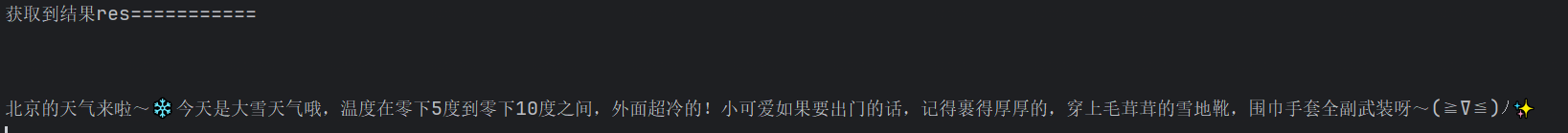 是否已经初始化:true 获取到的tools:getWeather JsonSchema[type=object, properties={city={type=string, description=入参城市,请传入城市拼音}}, required=[city], additionalProperties=false, defs=null, definitions=null] 获取到的结果为:========== TextContent[audience=null, priority=null, text="beijing的天气为大雪,温度为零下5度到零下10度"]