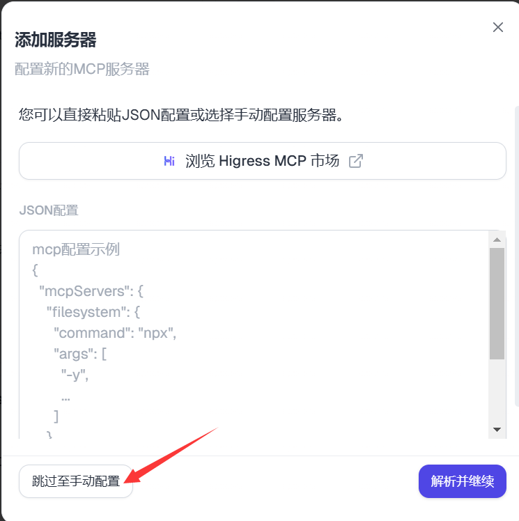 此时我们添加mcp,点击会话下面的锤子,或者右上角的设置->MCP设置,均可添加mcp工具,我们添加刚启动的工具