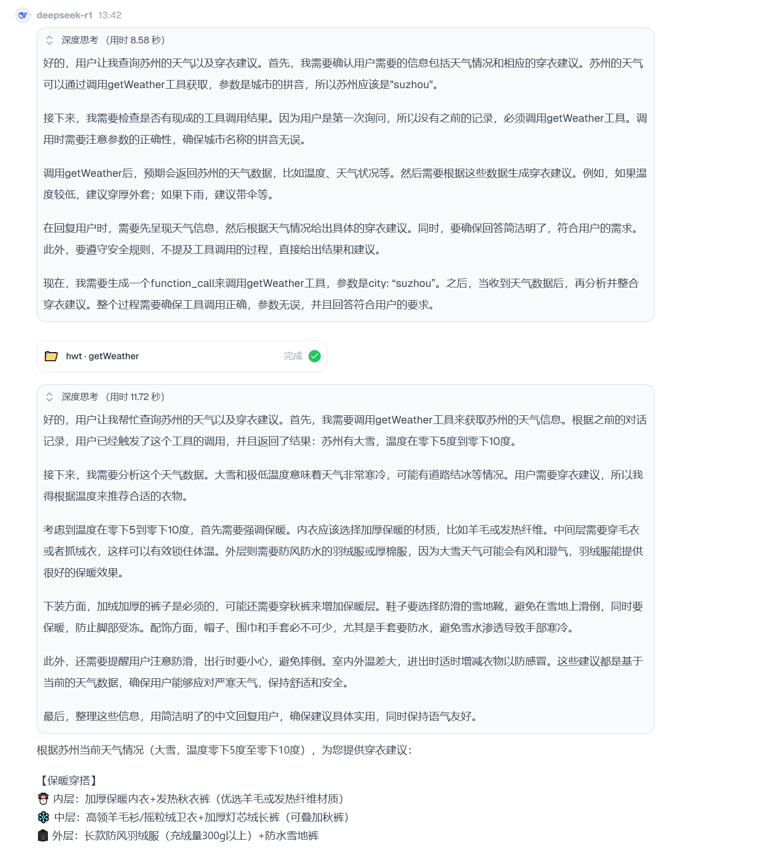 假设已经安装好deepchat,并已经配置了base_url和api_key,我们先来问deepchat一个天气问题,案例此处使用deepseek-r1模型